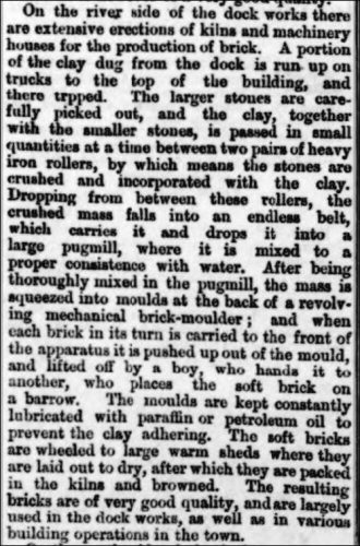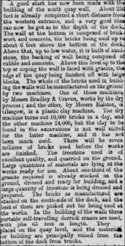 Below – 11/03/1881 – Greenock Advertiser – The James Watt Dock, Garvel Park, Greenock – details temporary kilns erected on-site to utilise the clay and manufacture brick for the construction of the docks and ancillary buildings.