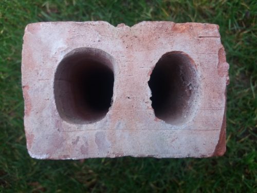 Below – Kindly donated by Peter Mason. This is an elongated example of a ‘drainage brick’ or a hollow internal building brick with 2 elliptical voids running the length of the brick. It measures 12″ long.