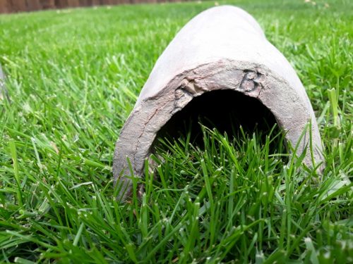 Below – ‘D’ shaped, flat bottomed drainage tile – outside diam 100 mm. The length is unknown as it is broken.