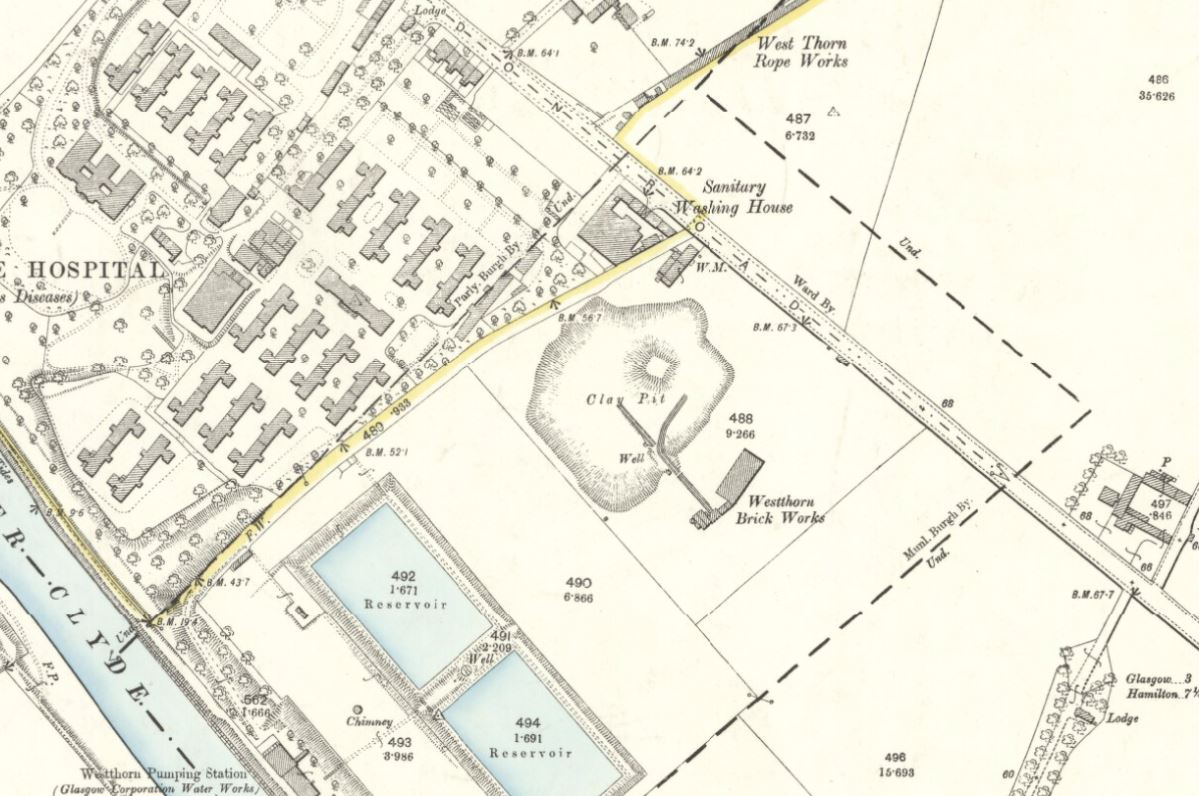 Below – 1912 – Westthorn Brickworks, Glasgow. The claypit is on the north side of London Road.